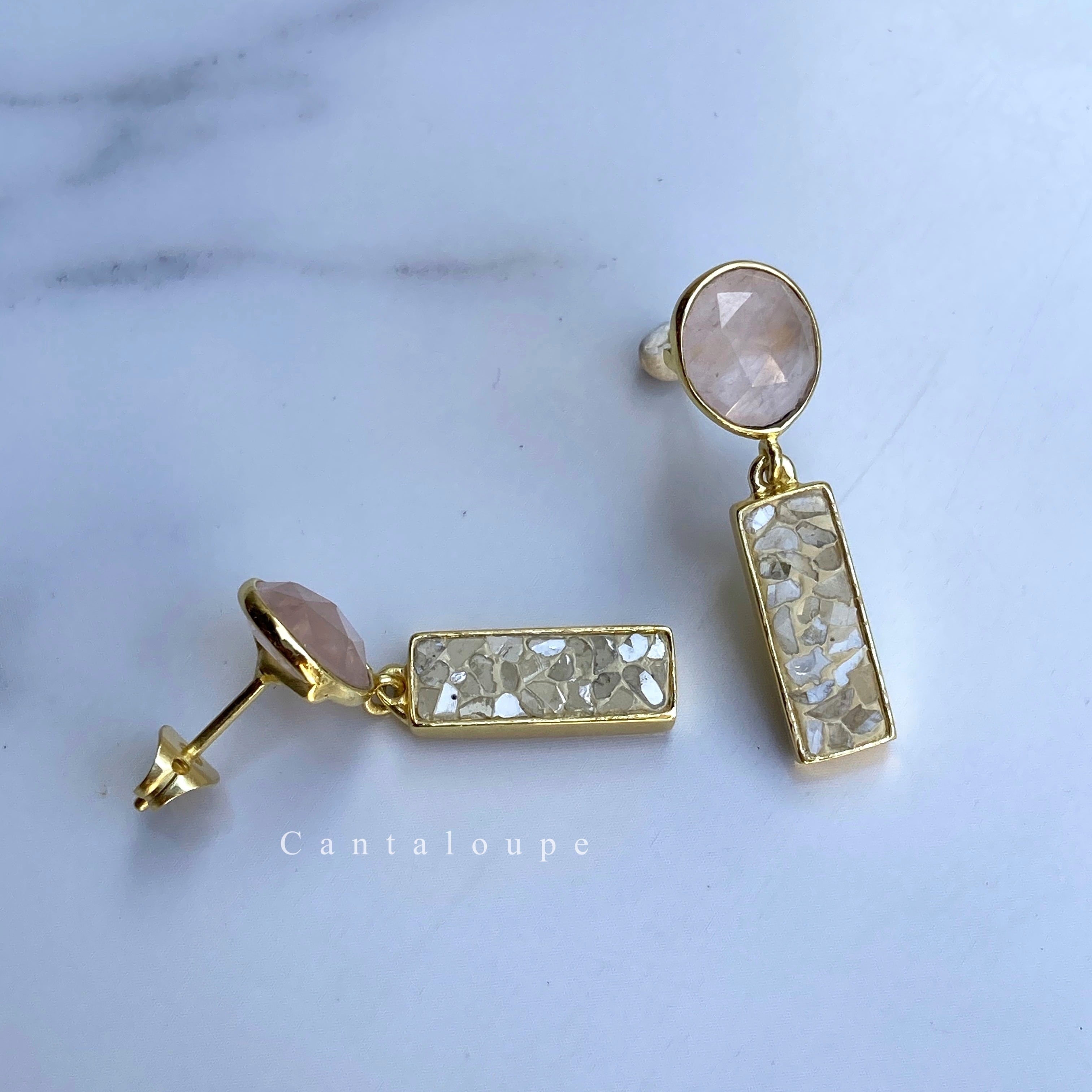ナチュラルラフダイヤピアス【18KGP】レクタングル・ローズクォーツ/ターコイズ