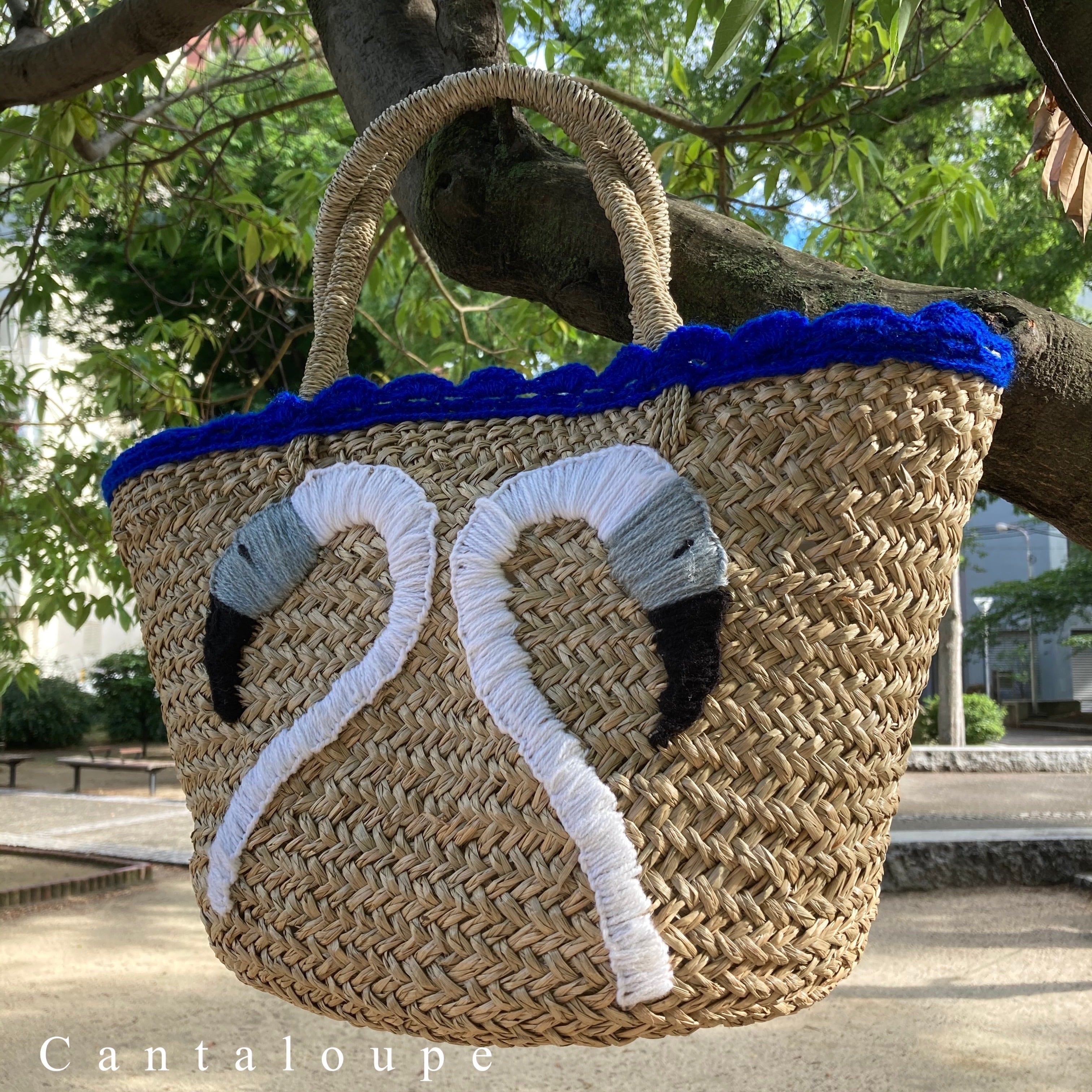 天然素材で編み込んだバスケットにコットンでフラミンゴを刺繍しました⭐︎