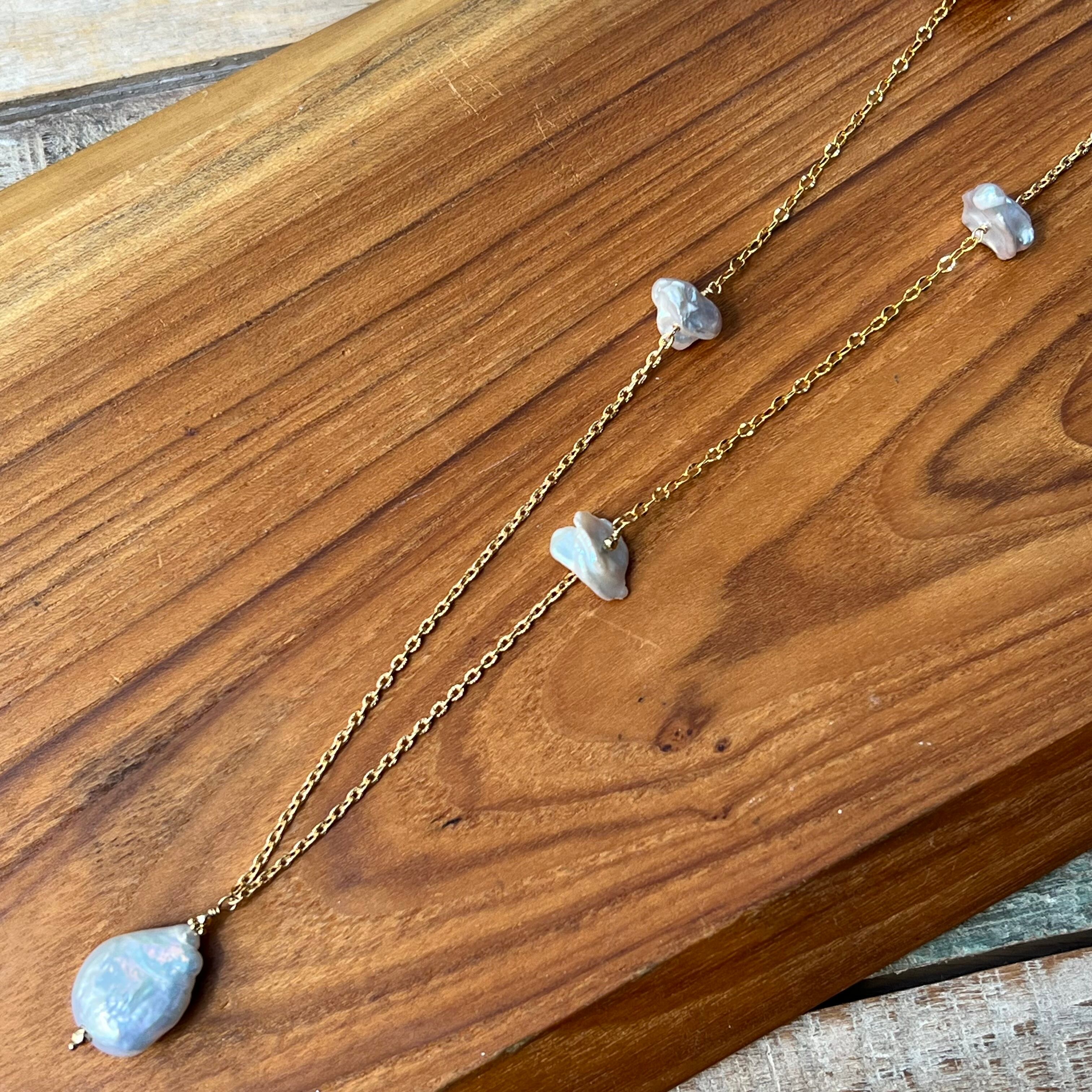大粒のバロックパールと不揃いな形が可愛いケシパールを織り交ぜて作成したセミロングネックレスです。