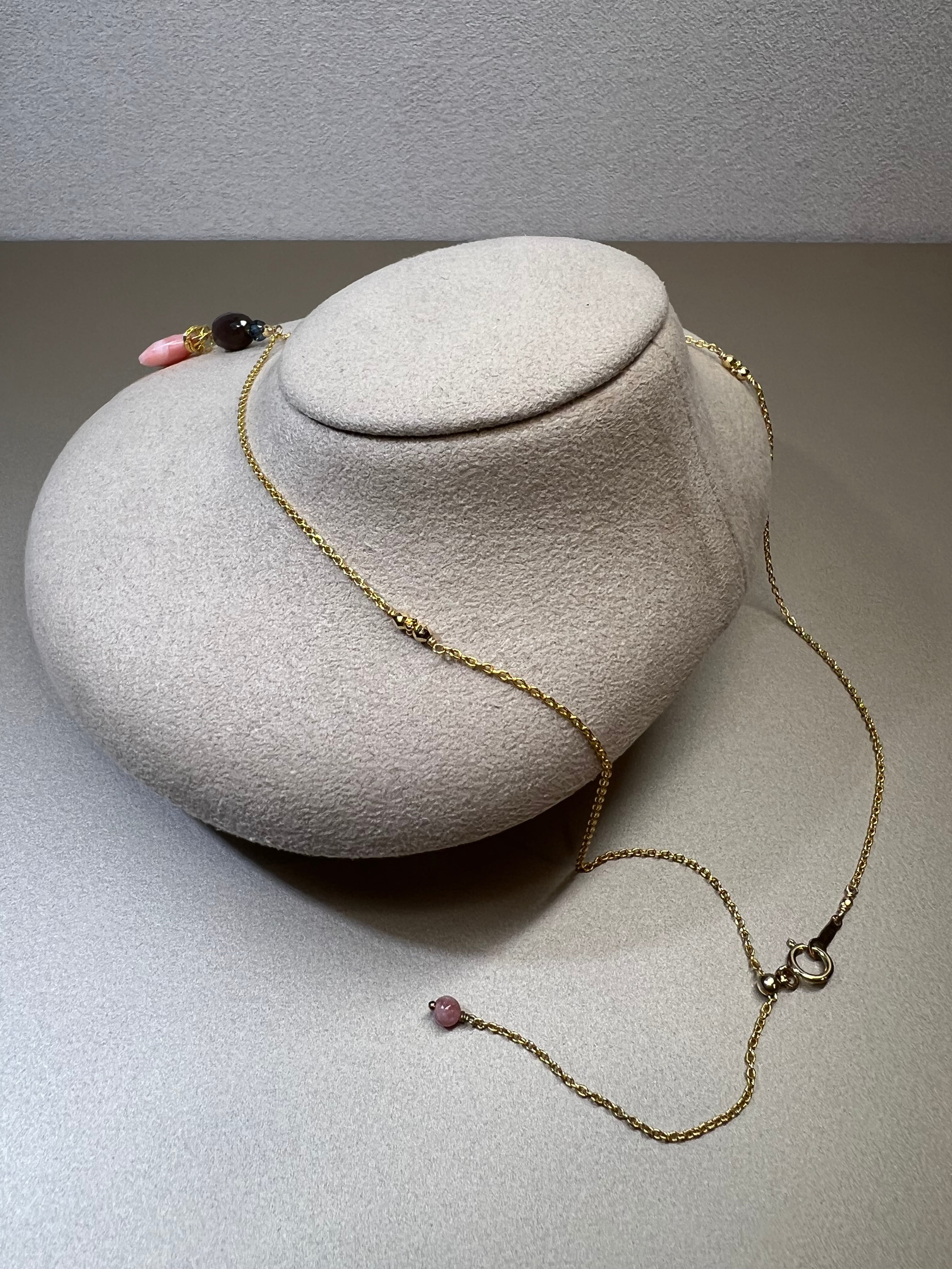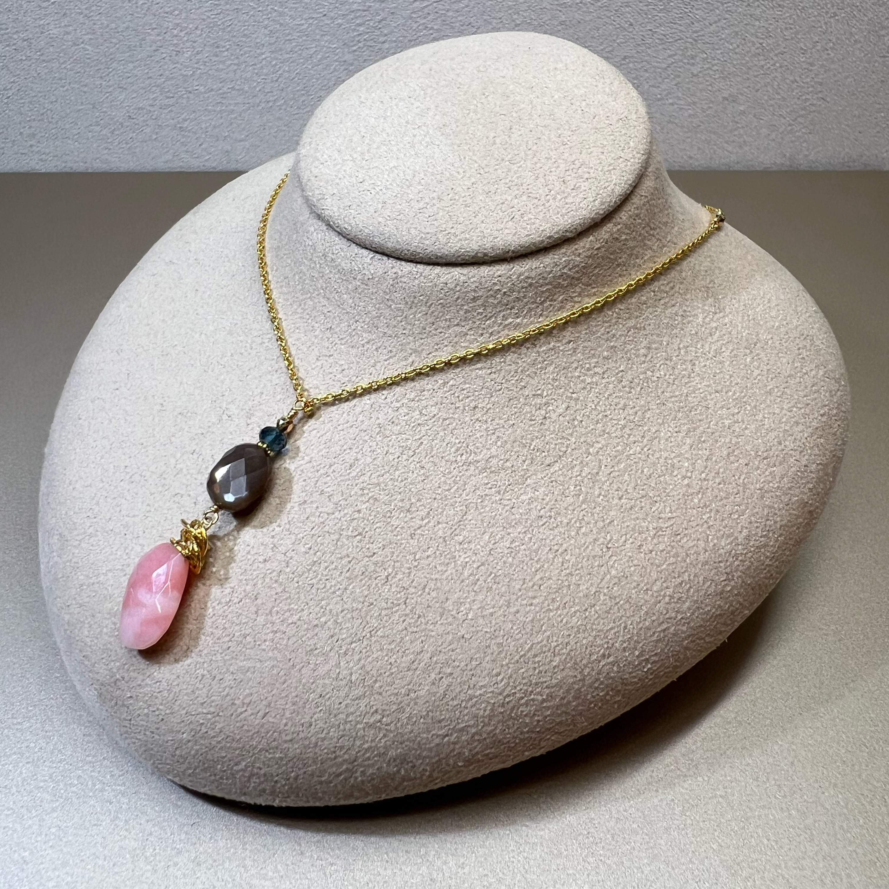 ピンクオパールとチョコレートムーンストーンが絶妙なコントラストを生み出し、装いを引き立てること間違いなし。高品質な天然石を贅沢に使用し、贅沢さと華やかさを兼ね備えたネックレスです。